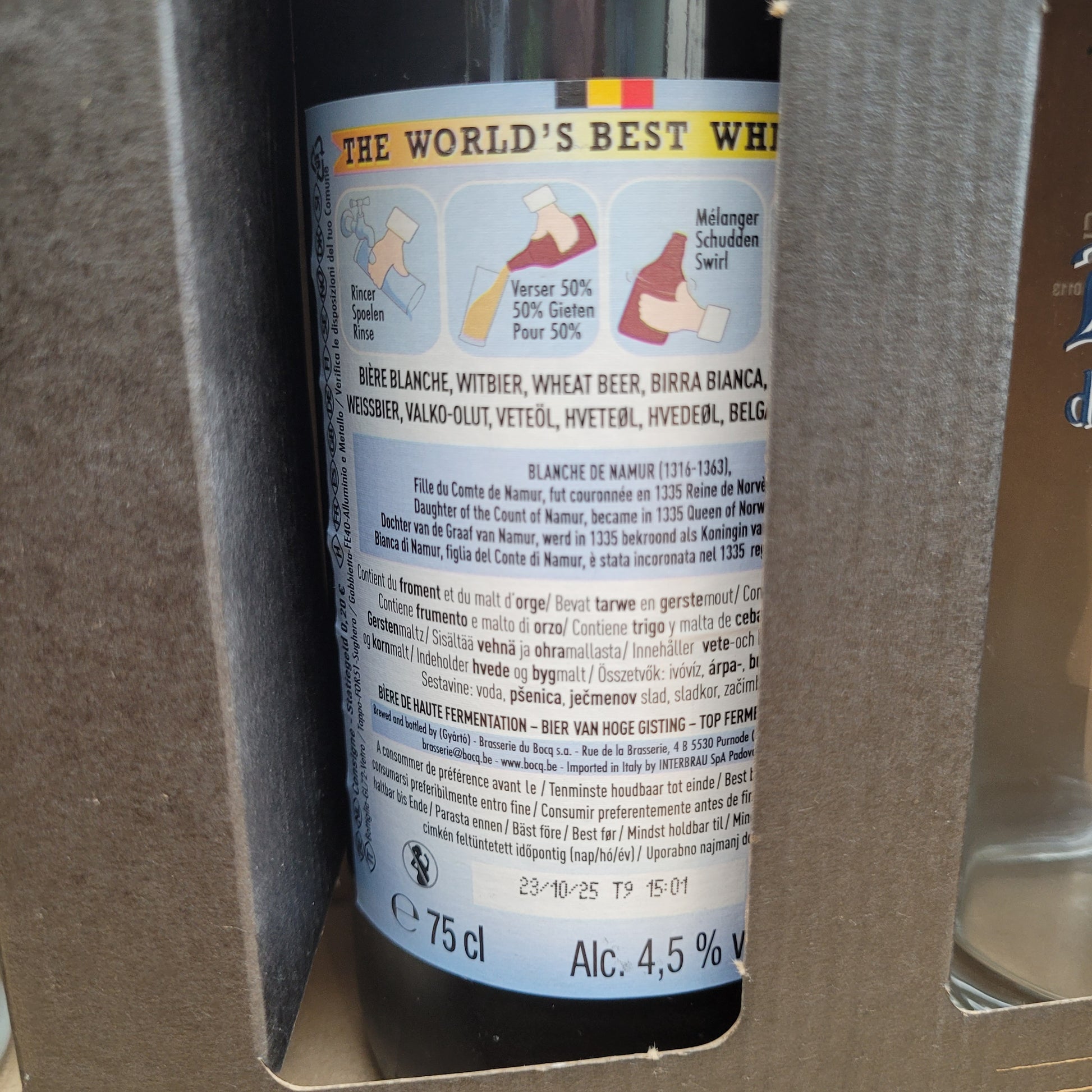 Une Blanche de Namur 75cl (attention DDM 23/10/25 mais toujours conservé au frais) + 2 verres Blanche de Namur 25cl.